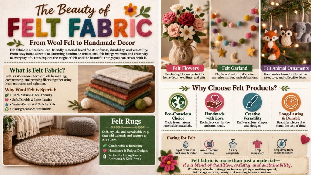 From wool felt to felt flowers, garlands, animal ornaments, and rugs, felt fabric offers endless possibilities. It’s more than just a material—it’s a blend of tradition, artistry, and sustainability.