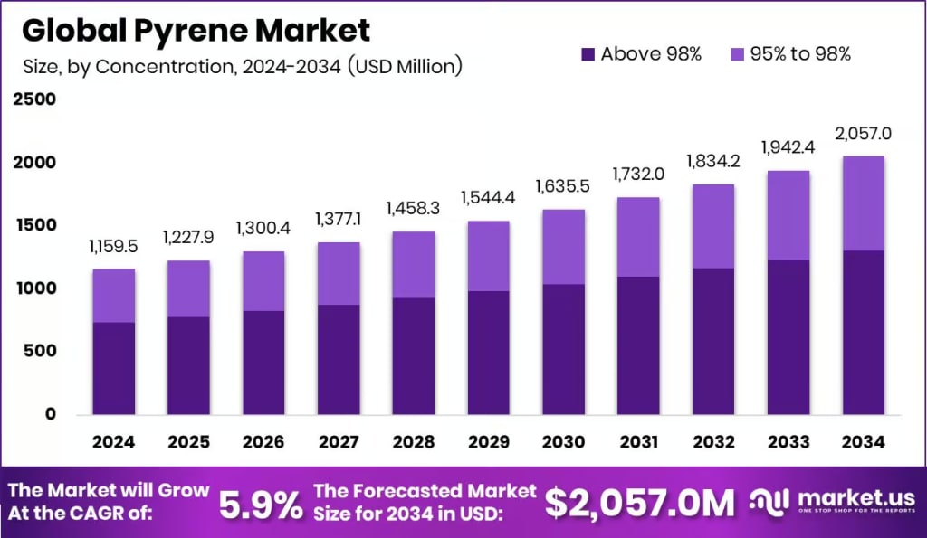 - The Global Pyrene Market is expected to be worth around USD 2,057.0 Million by 2034, up from USD 1159.5 Million in 2024, and is projected to grow at a CAGR of 5.9% from 2025 to 2034.