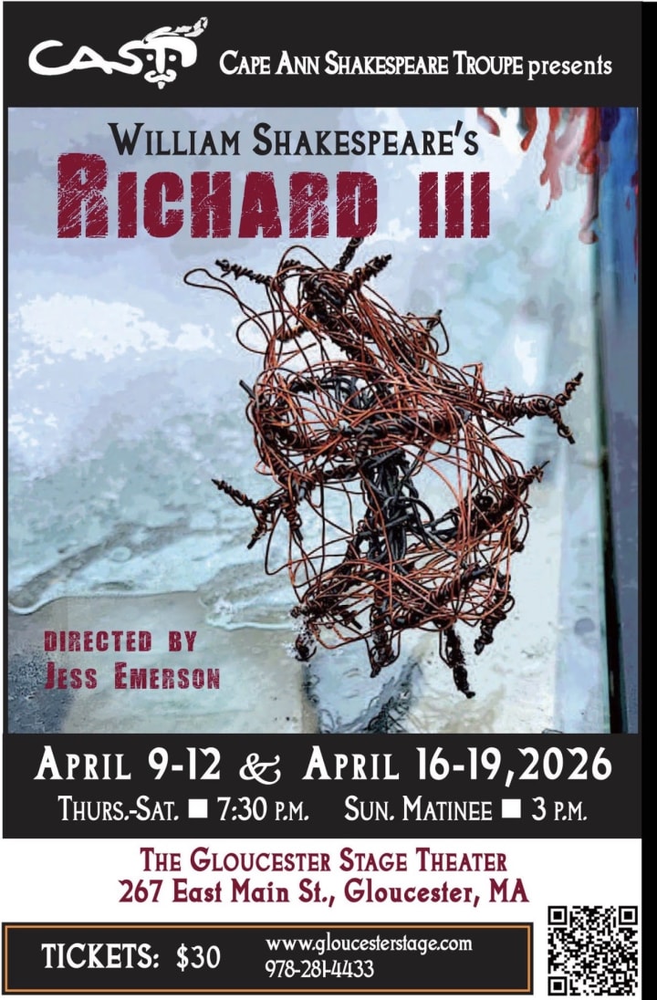 Cape Ann Shakespeare Troupe (CAST) presents William Shakespeare’s “Richard III” this April. The play centers on the ruthless Richard, Duke of Gloucester, as he schemes, betrays, and murders his way to the English throne. His atrocious rise to power leads to his downfall at the Battle of Bosworth Field.
