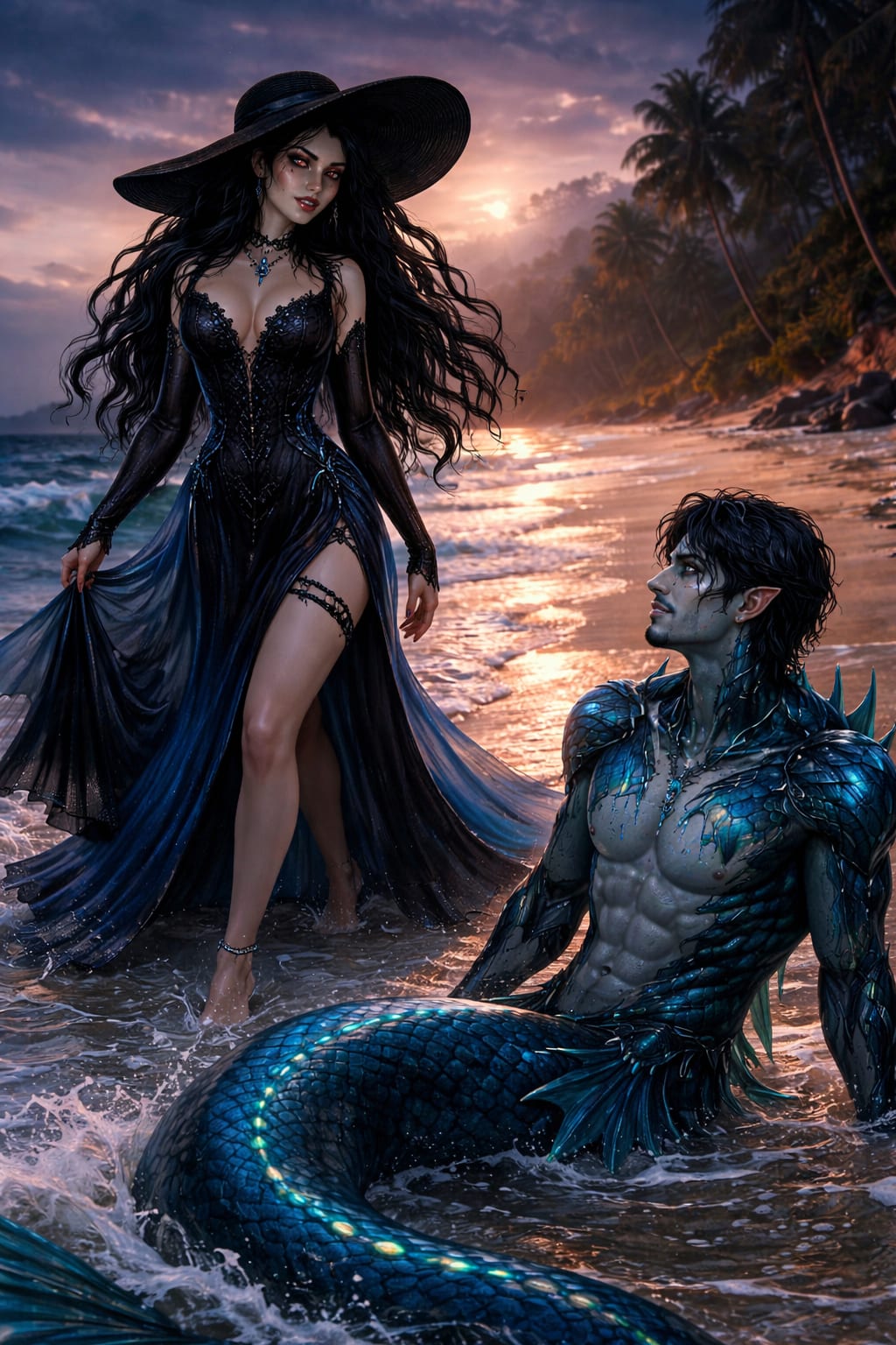 I heard giggling behind me as I constantly lifted my knees to my chest, this is no where like where I am from. I looked behind me to see a little vampiric woman standing there with a large floppy black gardening hat and a long blue and black gown. "Not use to a beach, strange for a sea creature as yourself," she smirked while chuckling.