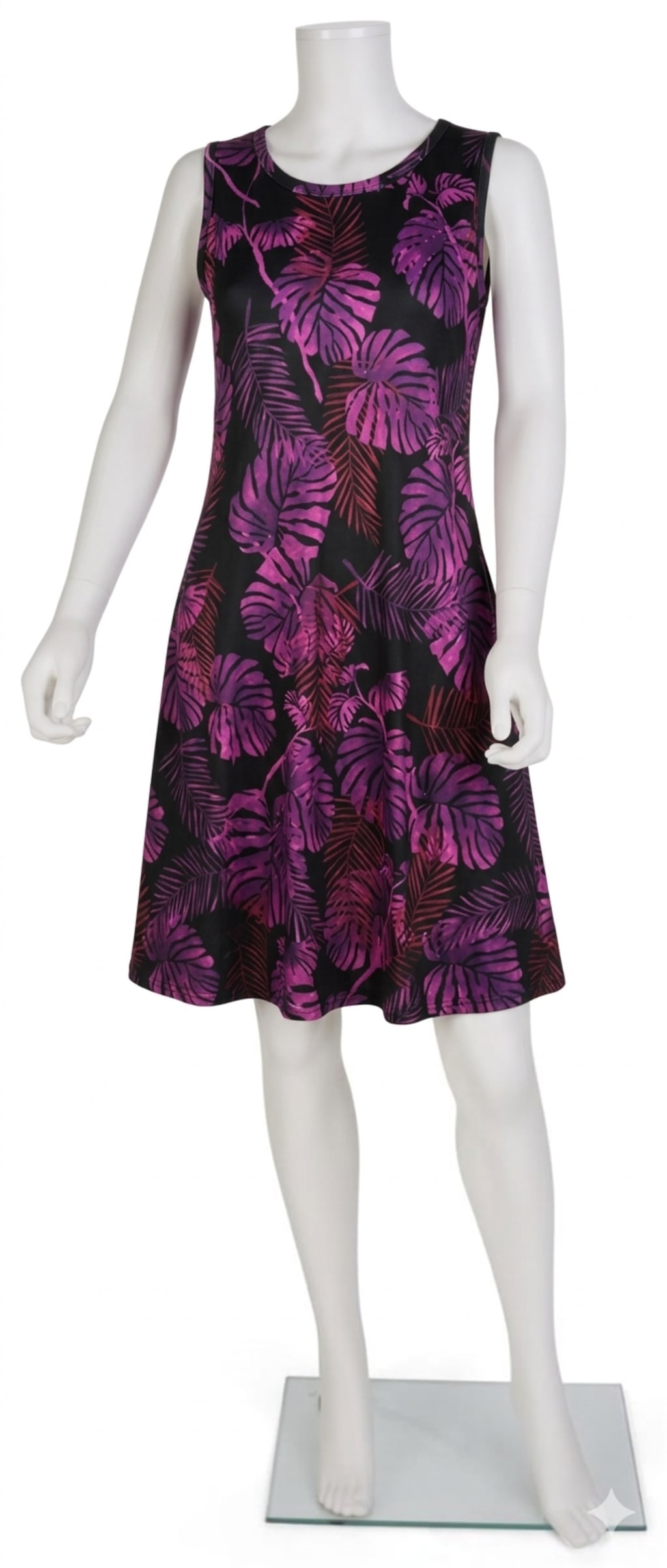 Why it won: Take a look at the featured image above. A sleeveless A-line dress anchored in a deep black or dark navy, bursting with vivid, rich purple and pink palm leaves.
