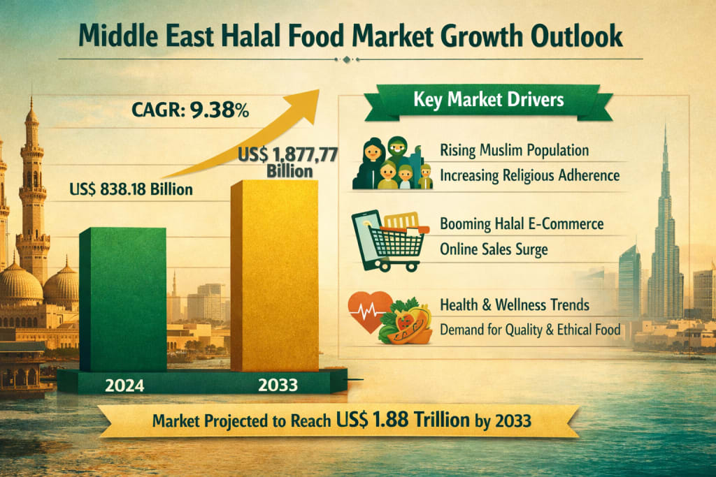 According to Renub Research, the Middle East halal food market is projected to grow from US$ 838.18 billion in 2024 to an impressive US$ 1,877.77 billion by 2033, registering a CAGR of 9.38% during 2025–2033 . This remarkable expansion reflects not only demographic growth but also the increasing appeal of halal-certified products among non-Muslim consumers worldwide.