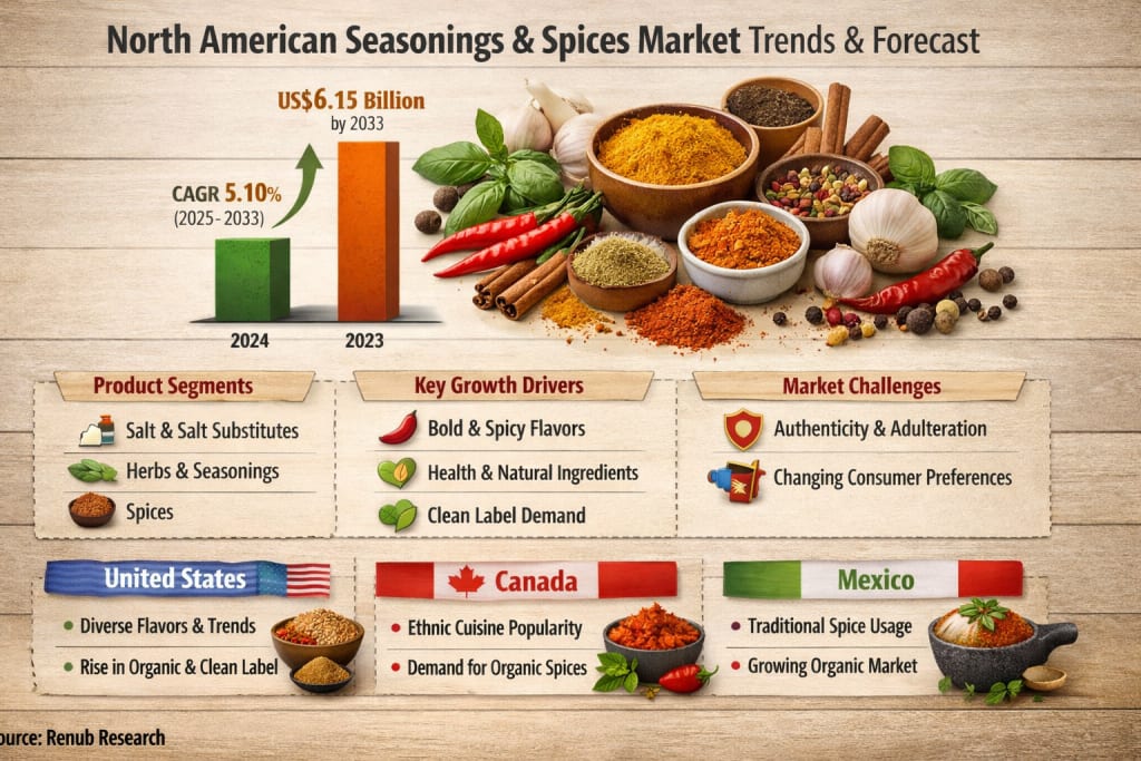 The North American seasonings and spices market is undergoing a dynamic transformation, blending traditional culinary roots with modern consumer preferences. According to Renub Research, the market is projected to grow from US$ 3.93 billion in 2024 to US$ 6.15 billion by 2033, expanding at a CAGR of 5.10% from 2025 to 2033. This steady growth reflects a broader shift in how consumers perceive food—not merely as sustenance, but as an experience enriched by flavor, health benefits, and cultural diversity.