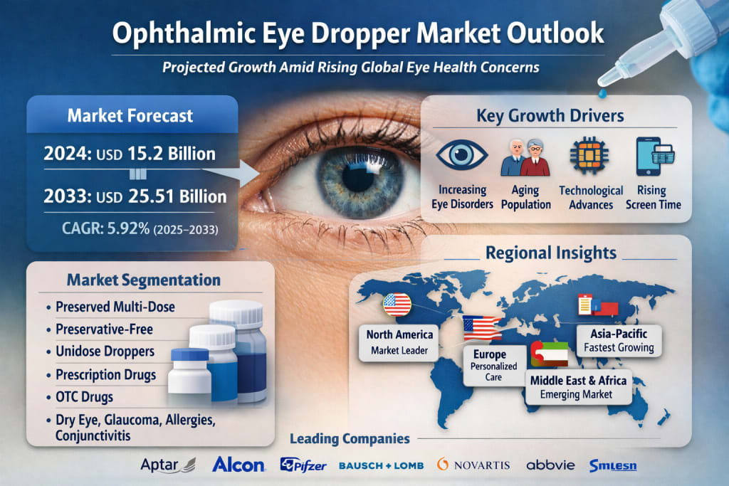 According to recent industry analysis, the global ophthalmic eye dropper market is projected to grow from US$ 15.2 billion in 2024 to US$ 25.51 billion by 2033, registering a compound annual growth rate (CAGR) of 5.92% from 2025 to 2033. This upward trajectory reflects both the growing burden of eye-related conditions and the healthcare sector’s response through innovation and improved accessibility.