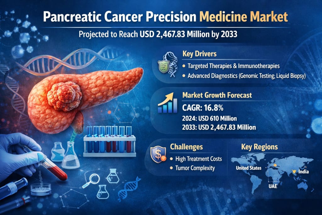 According to recent findings, the global pancreatic cancer precision medicine market is projected to grow from US$ 610 million in 2024 to US$ 2,467.83 million by 2033, expanding at a CAGR of 16.8% from 2025 to 2033.