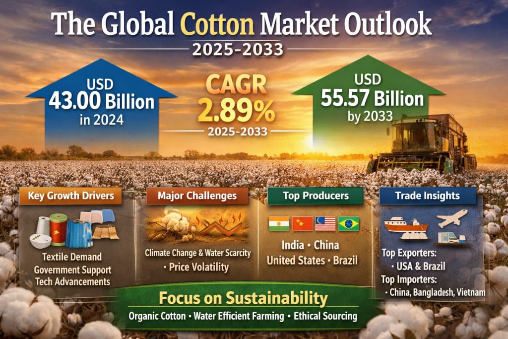 The global cotton market, one of the oldest and most essential pillars of the textile economy, is entering a phase of steady and strategic growth. With its roots deeply embedded in agriculture and its applications spanning from fashion to medical products, cotton continues to hold immense global relevance. According to recent industry analysis, the global cotton market was valued at USD 43.00 billion in 2024 and is projected to reach USD 55.57 billion by 2033, expanding at a compound annual growth rate (CAGR) of 2.89% between 2025 and 2033 .